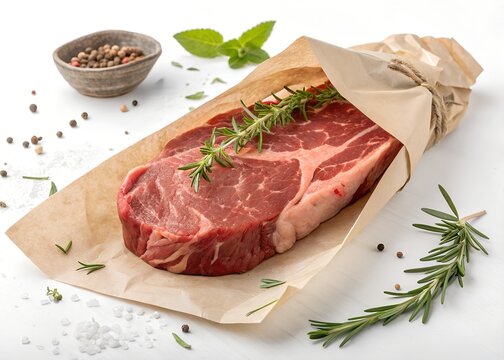Fresh raw pieces of beef meat with ingredients for cooking on a wrapping paper on white background