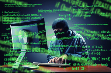 internet security and data protection concept, hacker in dark hoodie hacking into corporate system