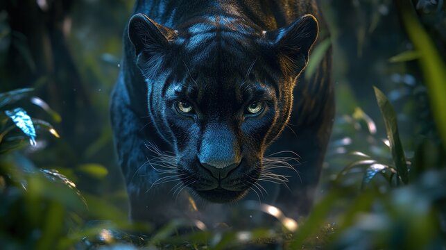 Black panther prowling in tropical foliage, menacingly approaches in bright, humid jungle background