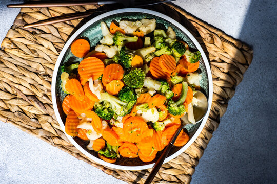 Plate of steamed beans, carrots, broccoli and cauliflower