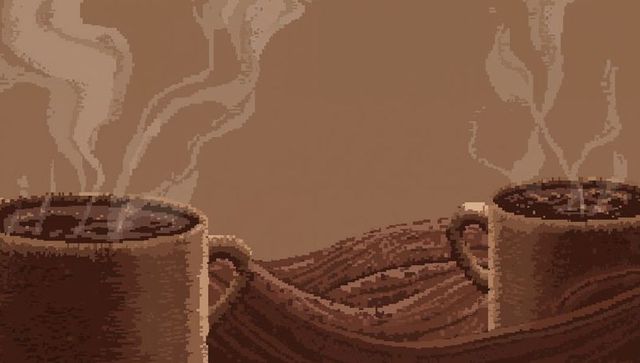 Steaming smiling pixel-art coffee mugs trio with spiral steam and pink cheeks
