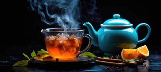 tea kettle and cup of steaming tea, International Tea Day concept background with free copy space