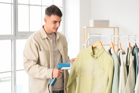 Pretty young woman steaming shirt with modern garment steamer on pink background