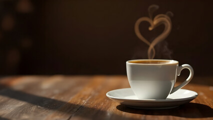 Steaming black coffee in morning light on wooden table
