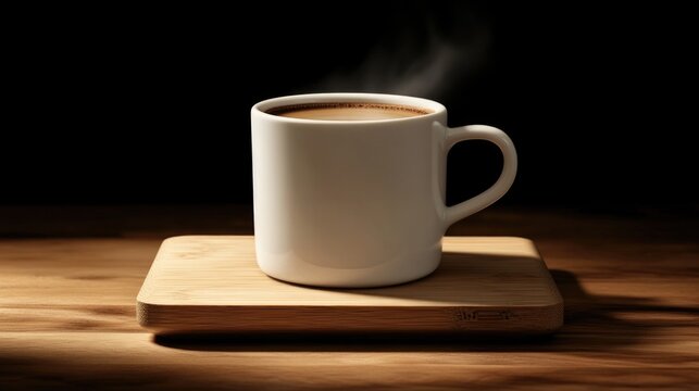 A steaming mug of coffee rests on a wooden coaster
