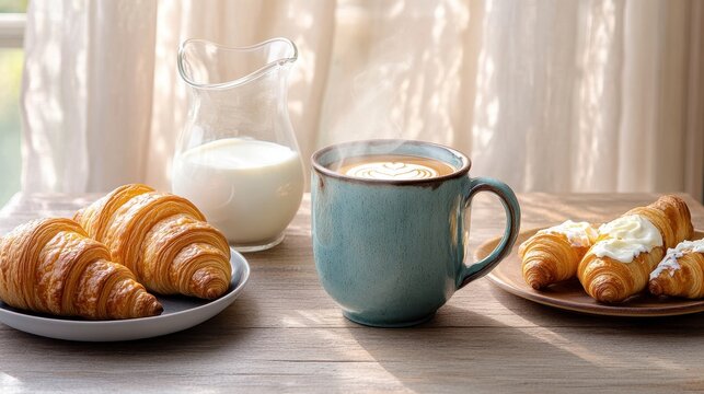 A steaming cup of artisanal coffee served in a handmade ceramic mug, placed on a wooden table with a small pitcher of cream and a plate of buttered croissants. The morning sunlight filters through