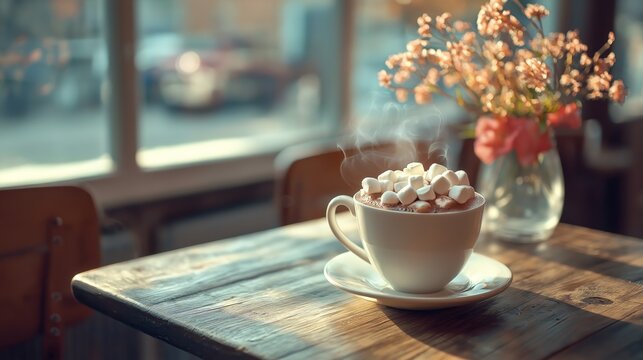 A steaming cup of hot chocolate topped with marshmallows sits on a rustic wooden table beside a vase of flowers