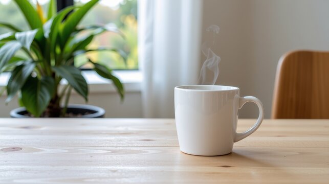 Pouring hot coffee into white mug with steam in cozy kitchen