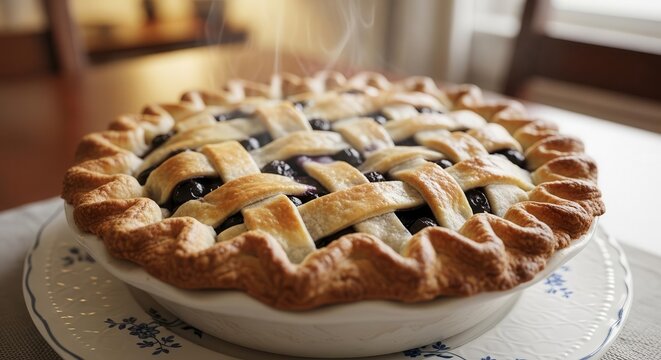 Freshly Baked Lattice Pie with Steaming Filling, Ready to Be Sweetly Enjoyed