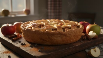 Freshly baked organic homemade steaming apple pie close up detail against kitchen background.