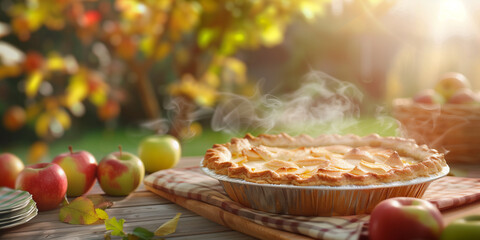 A freshly baked apple pie with a golden crust, steaming hot and surrounded by fresh apples and cinnamon sticks.
