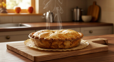 Warm apple pie steaming on wooden board, cozy kitchen background, homemade comfort food
