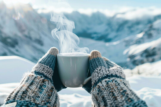 Cozy travel concept. Hands in warm gloves holding a steaming mug or cup with beverage coffee tea on the background of beautiful snowy mountains. Copy paste empty place for text