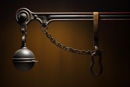 Old steelyard hanging showing its age, with metal weight, chain, and leather strap against a brown background