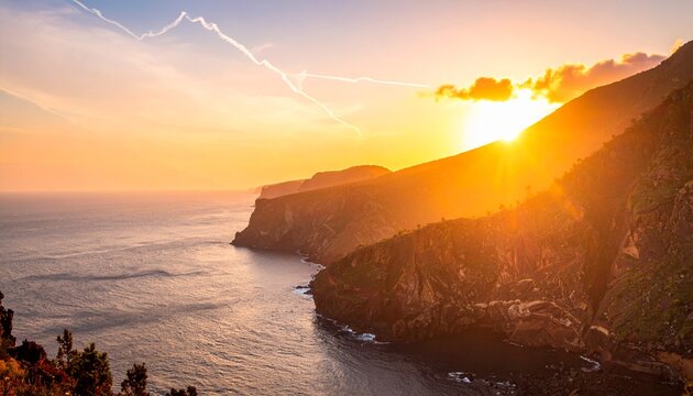Dramatic cliffs under vibrant pink sky at ocean's edge