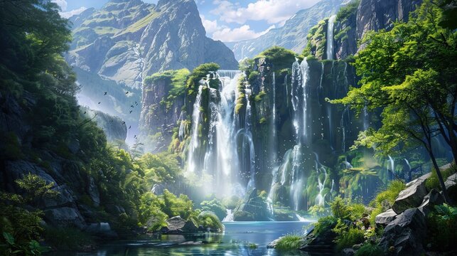 Majestic waterfall flowing through mossy rock formation