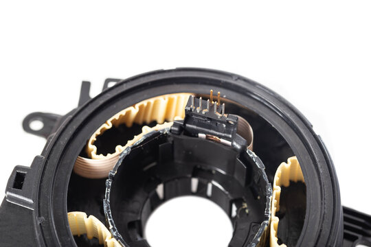 disassembled broken steering column electrical cable on white background, isolate, close-up
