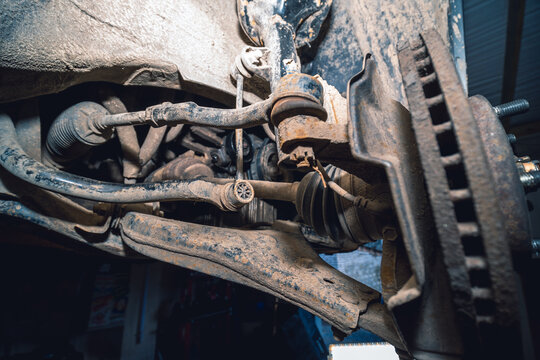 Front levers and stabilization racks of the car, ABS sensor, brake system, Disc and pads. Silent blocks. Car service and repair, old parts for replacement. Damage suspension and gear drive
