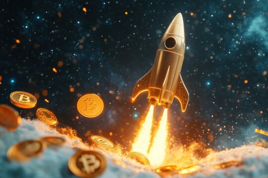 Rocket and gold coins launching into space, representing crypto and business success