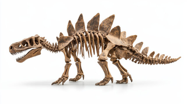 A skeletal stegosaurus fossil, sepia tones with intricate fossil textures, sharp contouring on a pure white background. Museum exhibit style