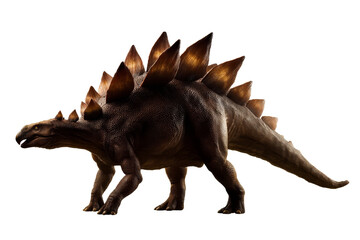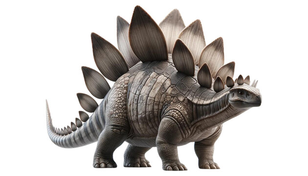 A realistic image of an isolated Stegosaurus, a large herbivorous dinosaur with distinctive back plates and tail spikes.