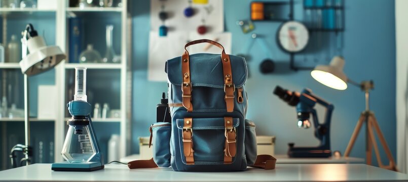 Scientific experiment tools on the desk. Empty blackboard. Education concept.