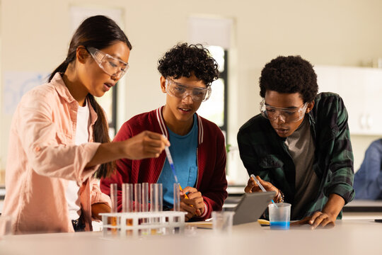 Conducting science experiment with test tubes and safety goggles, teenagers in high school