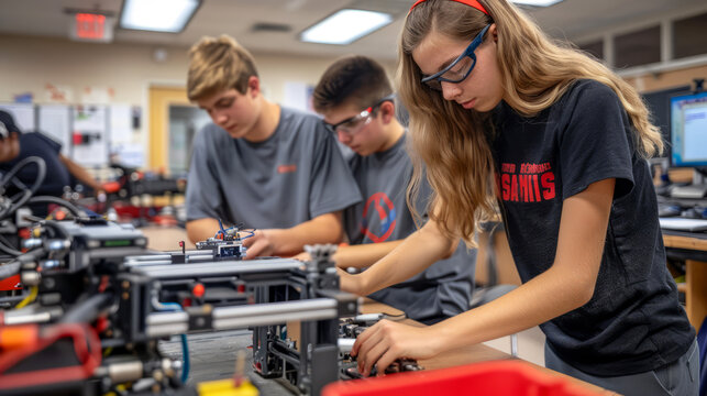 Diverse teens collaborating in stem drone project with robotics focus