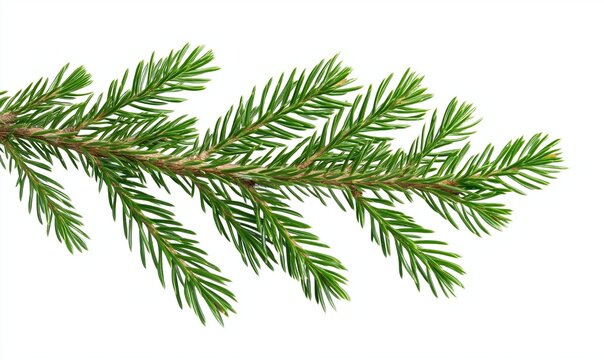 Bright green spruce branch is extending into the white space with its many needles. The branch is isolated on a pure white background