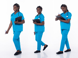 Full length 20s young African American Woman Medical Healthcare Nurse, walking forward left right