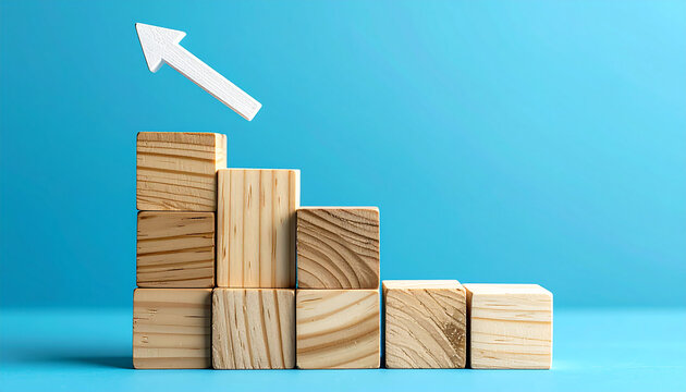 Wooden cubes stacked like steps with white arrow rising upwards. Business growth, success, progress