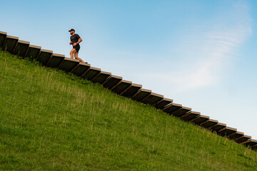 Side view of young business man climbing illuminated arrow stairs to success on concrete wall background in interior. Financial growth, career development and forward concept.