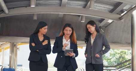 Team leadership businesswoman walking together on street city life. Group of business people team leader woman power. Multiethnic asian people step up urban lifestyle. Crowd Women walking up stair