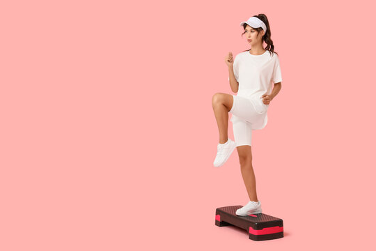 Sporty young woman training on aerobic stepper against pink background