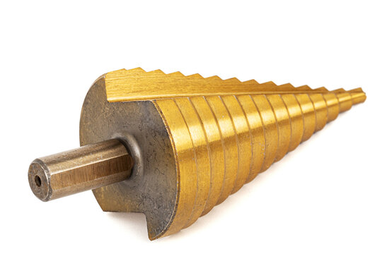 Drill in the shape of a cone for drilling. Step drill bit and power tool. Gradual hole cutter in various materials