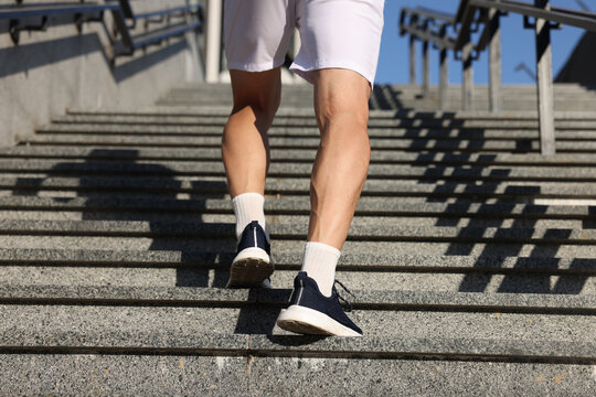 stairway. Close up legs and shoes sneakers of young woman one person walking stepping going up the stairs in modern city, success, grow up.