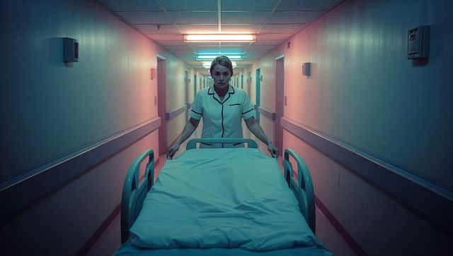 Nurse pushing gurney in sterile hospital corridor at night