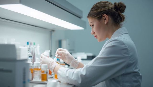 Lab technician inspecting amber reagent bottle with pipette under sterile bench lighting