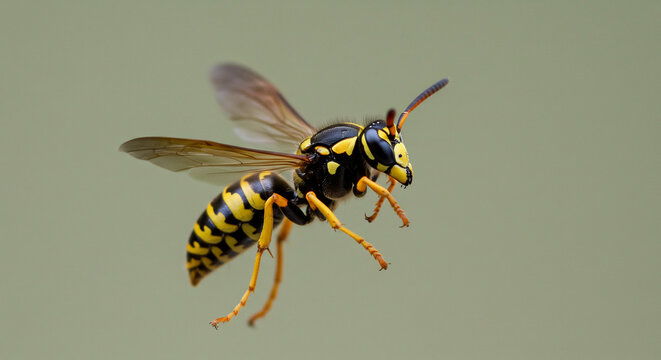 Eine gelb schwarz gestreifte Wespe fliegt scharf detailreich und dynamisch im Makro festgehalten in klarem weichen Licht.. AI Generated