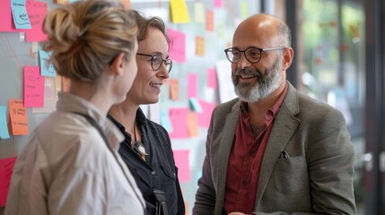 Team collaboration during a brainstorming session with sticky notes on the wall. Professionals engaging in creative discussion.