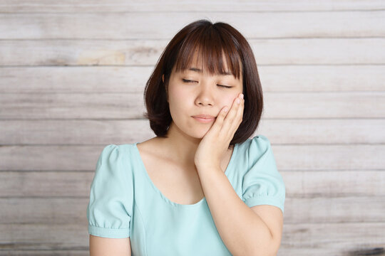 喉の痛みで辛そうな表情を浮かべ、首を手で押さえる若い女性