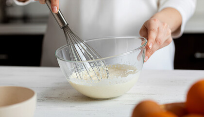Close-up: Mixing batter in a clear bowl with a spatula on a white countertop apron on