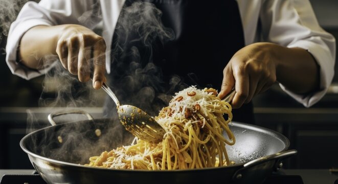 Chef stirring delicious, steamy spaghetti in a pan for a culinary masterpiece, ready to be served in your restaurant or home, creating a warm atmosphere
