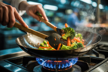 Chef is cooking stir-fry vegetables in a wok on a gas stove