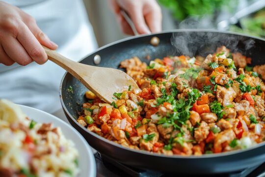 Person stirring colorful vegetables and meat in a hot pan, preparing a delicious and healthy homemade meal