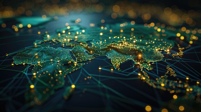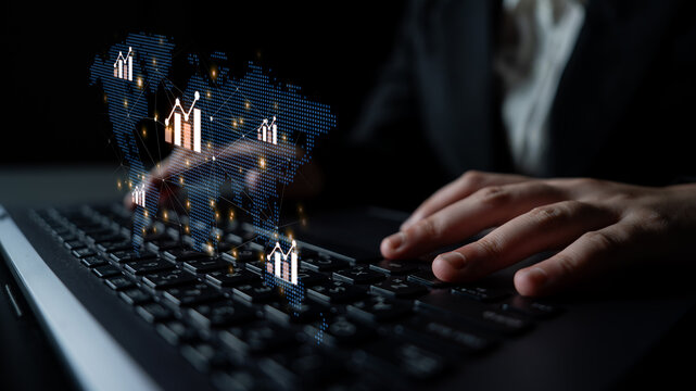 Close-up of a hand interacting with a digital world map, highlighting glowing market data and trends on a high-tech interface.
