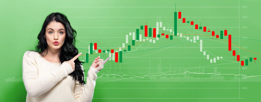 Stock market candle chart with young woman pointing on a green background