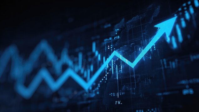 A glowing, upward-trending blue line graph, superimposed on a complex, dark digital backdrop.  Data points and other graphical elements are visible