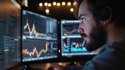 Corporate worker analyzing fund market statistics data on computer screen, looking at company investment revenue. Stock market monitoring website, financial analytics diagrams