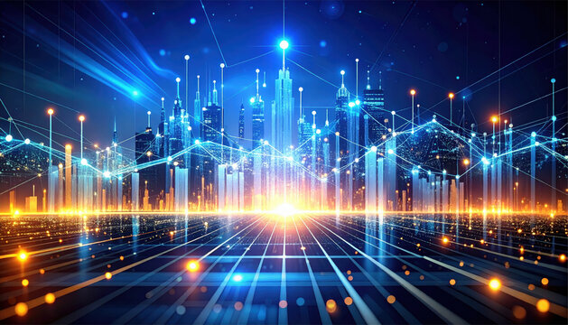Cityscape sunset backdrop with overlaid glowing digital data streams